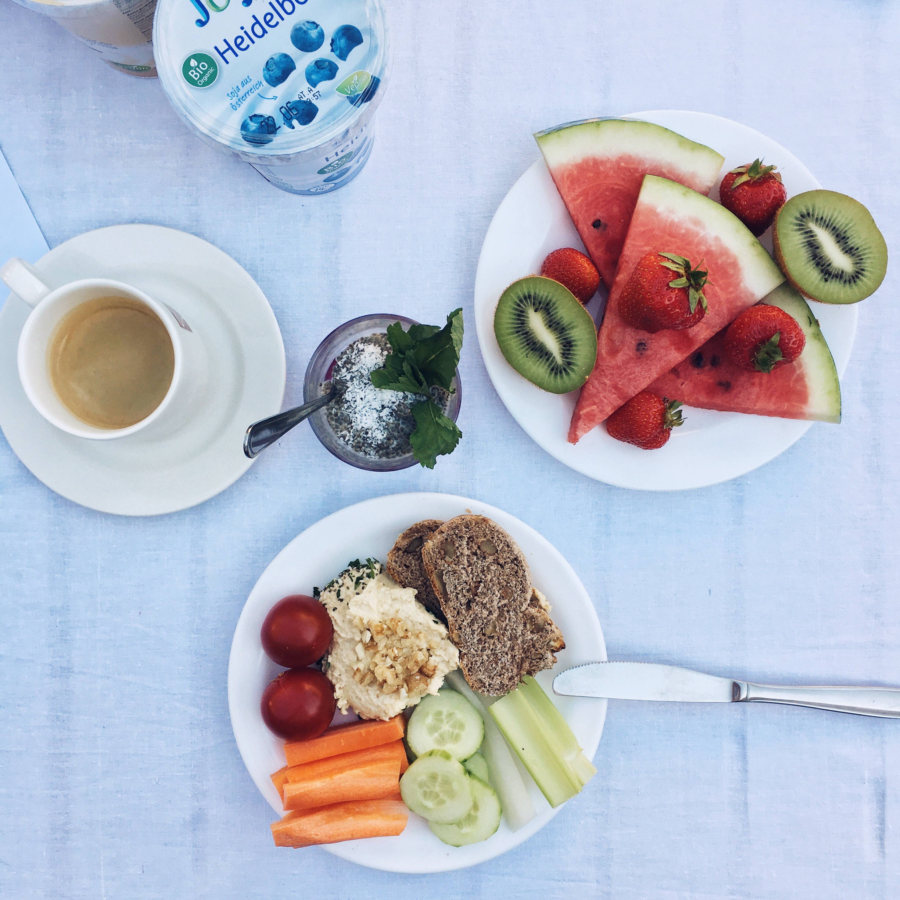 Anfang Juni war ich zusammen mit Emina bei der Joya Yoga Convention und Joya hatte uns zu ihrem Brunch eingeladen. Es gab einfach alles, was das Veganer-Herz begehrt: vegane Kuchen, Milchreis, Chia Pudding, Bowls, Brot, Hummus, Aufstriche, Gemüse, viel Obst und natürlich die volle Palette der Joya Produkte.